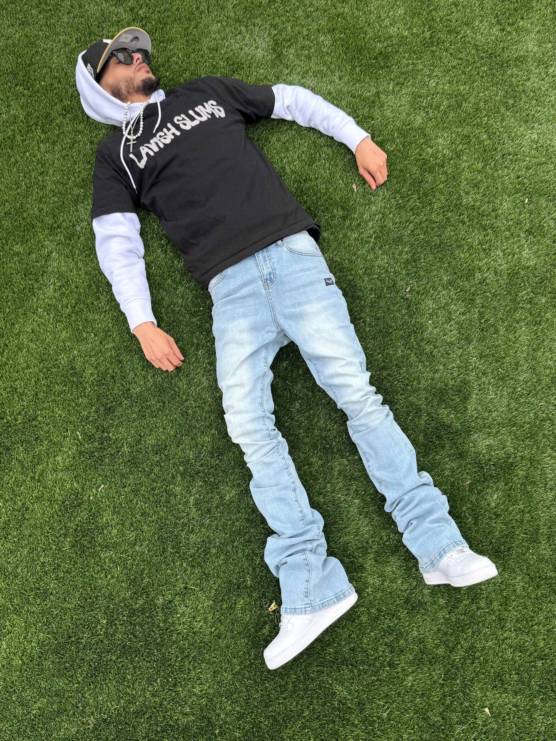Stone washed denim. Stacked fit. Quality denim. Long pants.